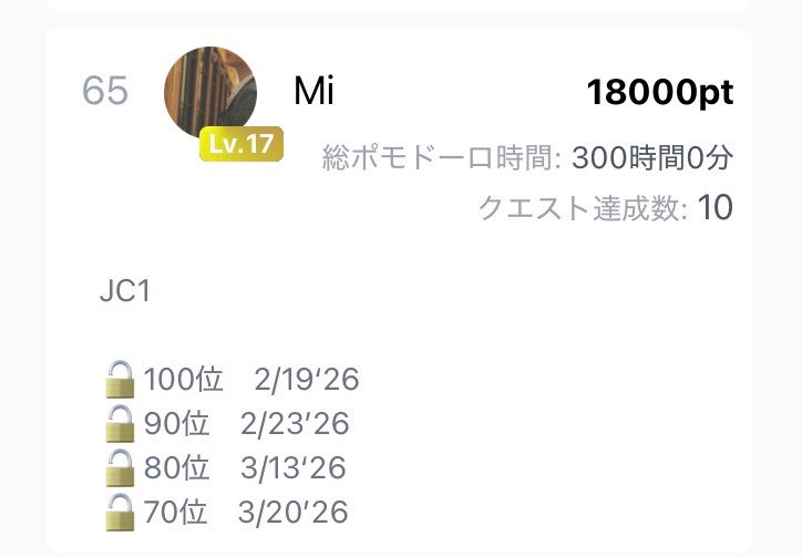 JC1 🔓100位 2/19‘26 🔓90位 2/23’26 🔓80位 3/13‘26 🔓70位 3/20’26