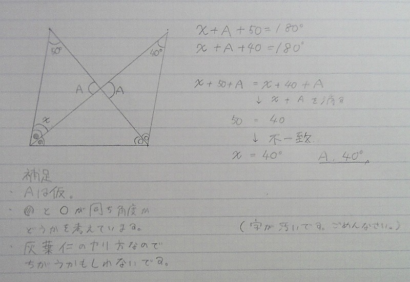 遅くなりましたが、解いてみました。字は汚いし、送るのは遅いしごめんなさい。参考になったら嬉しい。
